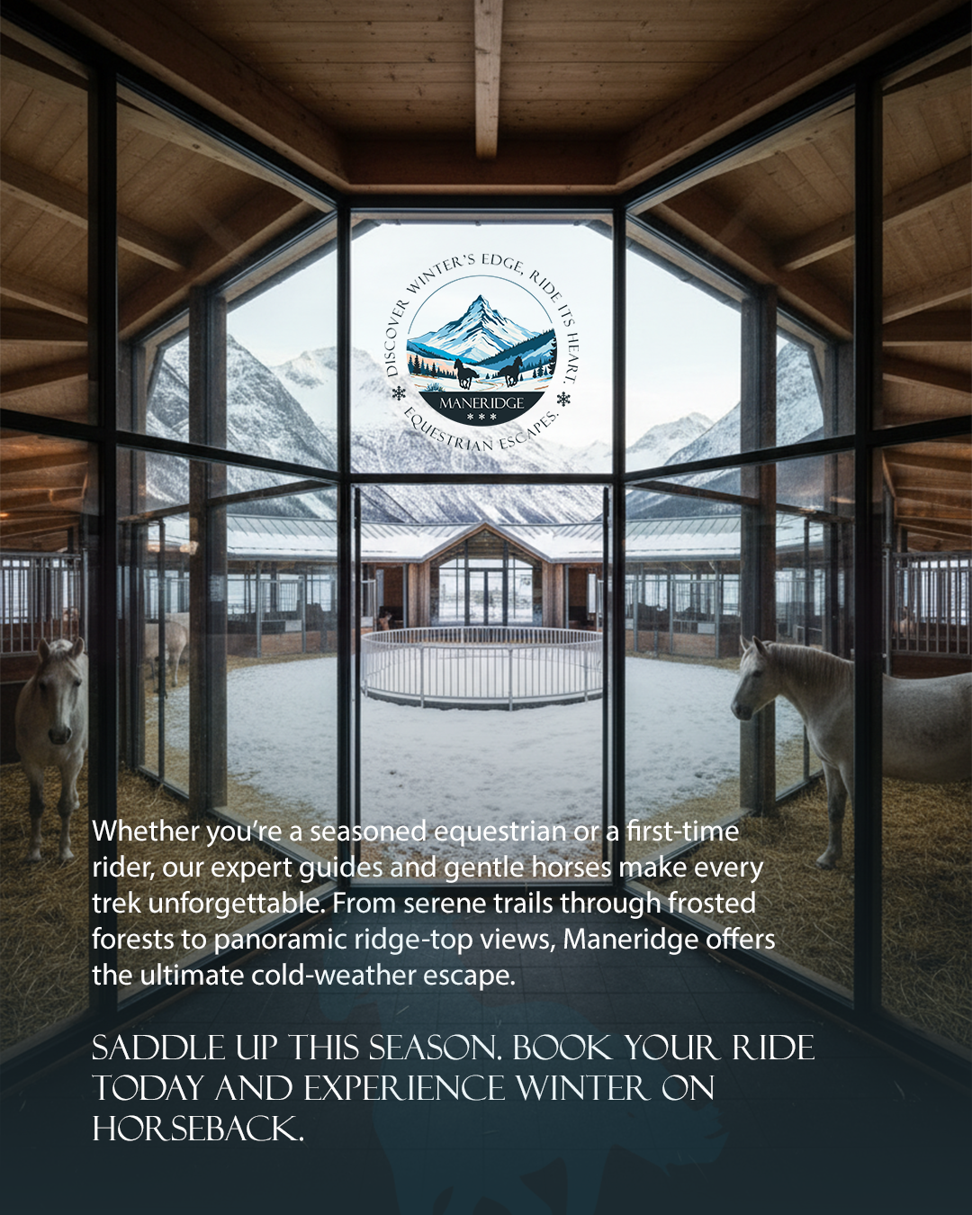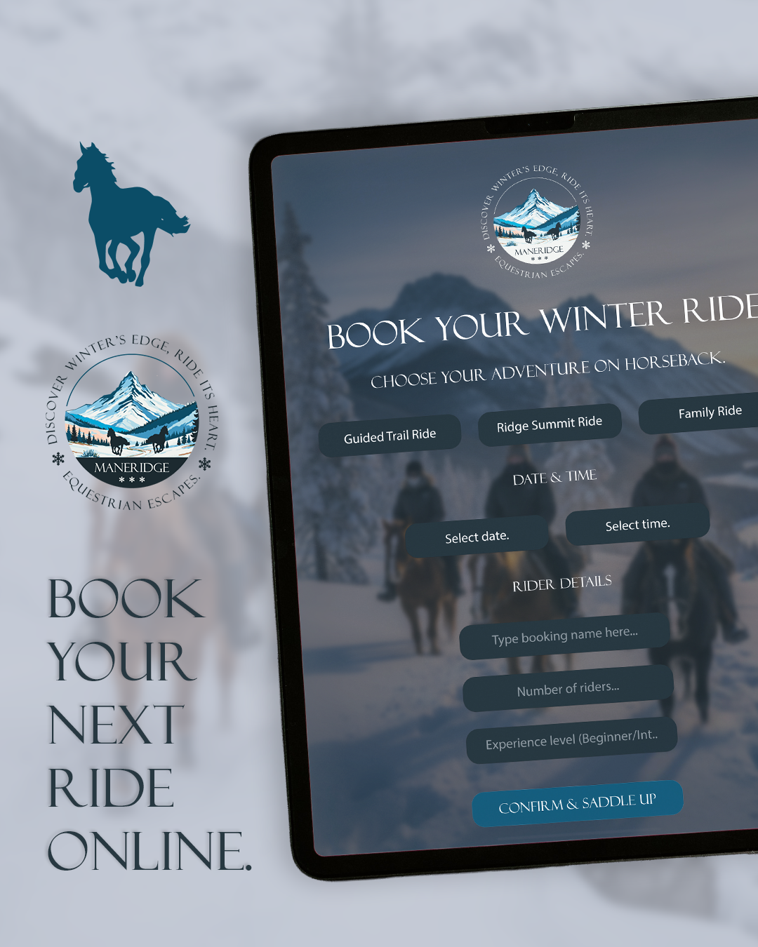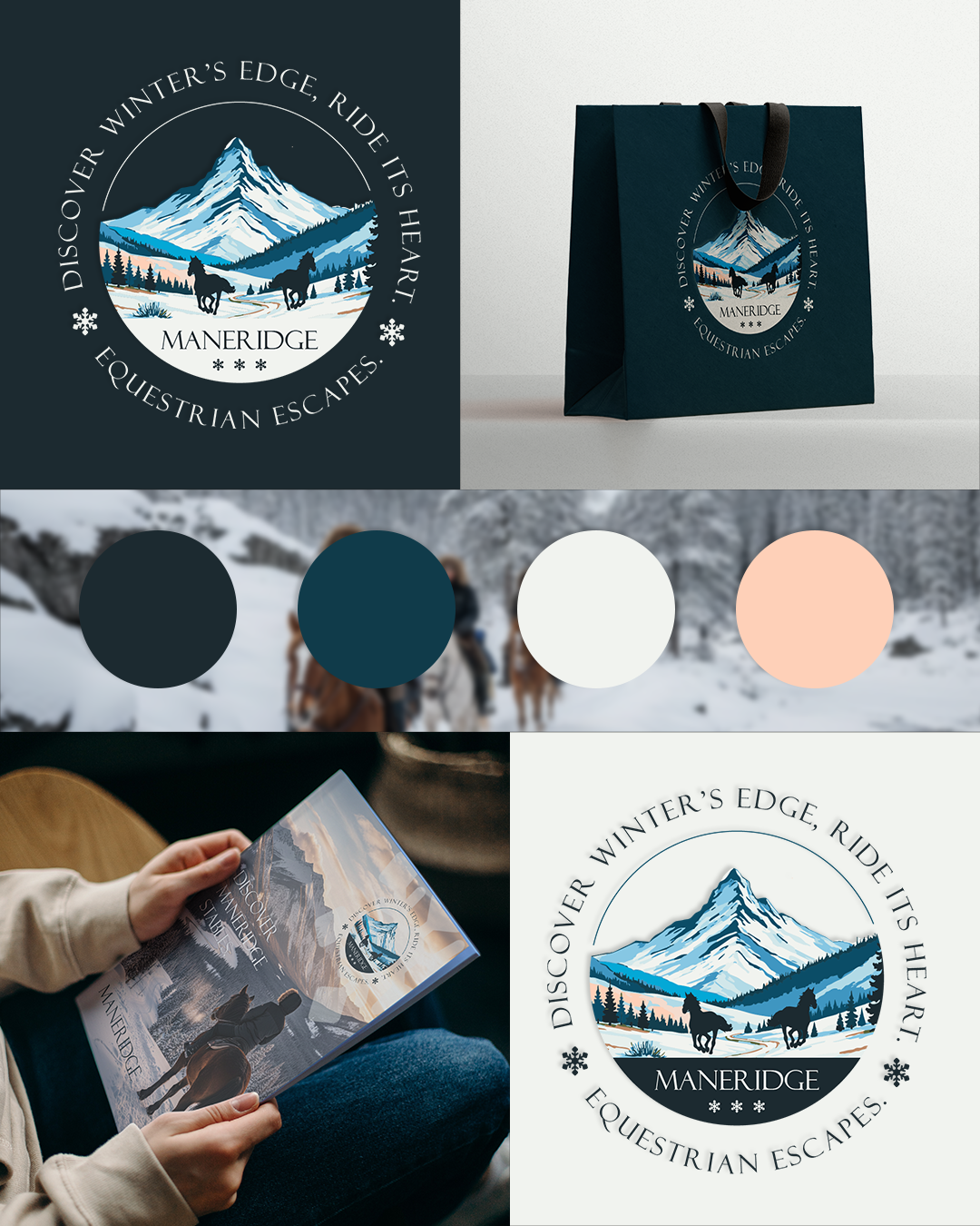For Maneridge, a winter horseback riding destination, I crafted a visual identity that reflects the serene strength of equestrian experiences in snow-covered landscapes. The logo takes the form of a round emblem, combining light navy blue and ice blue tones to evoke crisp mountain air and frosted terrain. Set against a snowy backdrop, the design balances elegance and ruggedness, symbolizing both the rider’s bond with the horse and the vast openness of high-elevation ridges. This emblem anchors the brand’s identity, offering a timeless mark that translates seamlessly across digital platforms, signage, and merchandise.
