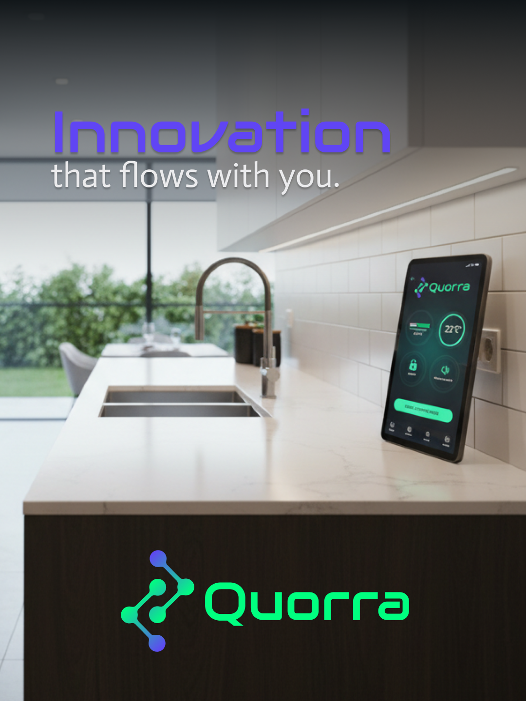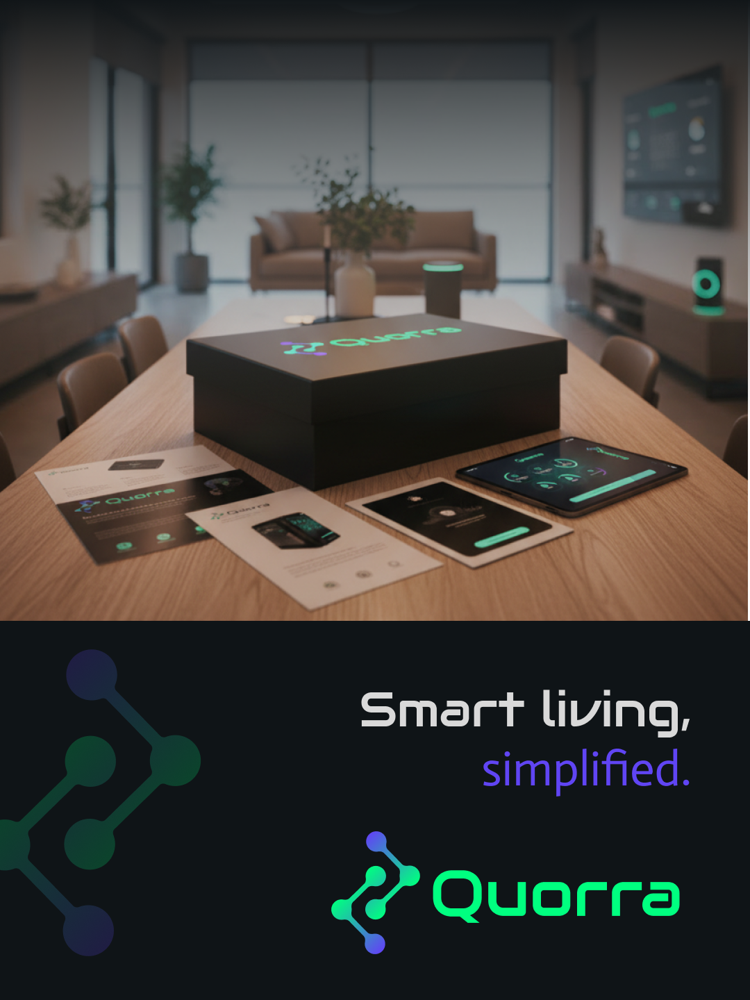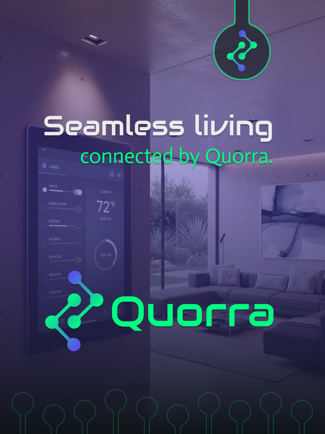 Quorra is a smart home system that seamlessly connects you to every aspect of your home, inside and out. Its design embodies a modern aesthetic, featuring a bold green paired with a subdued blue as the core brand colors. The overall visual identity is crafted to feel simple, intuitive, and effortless.