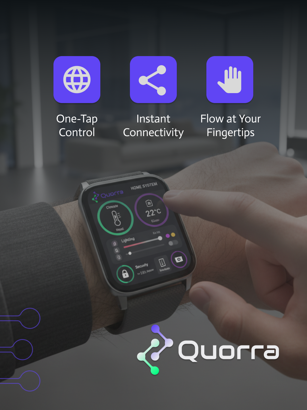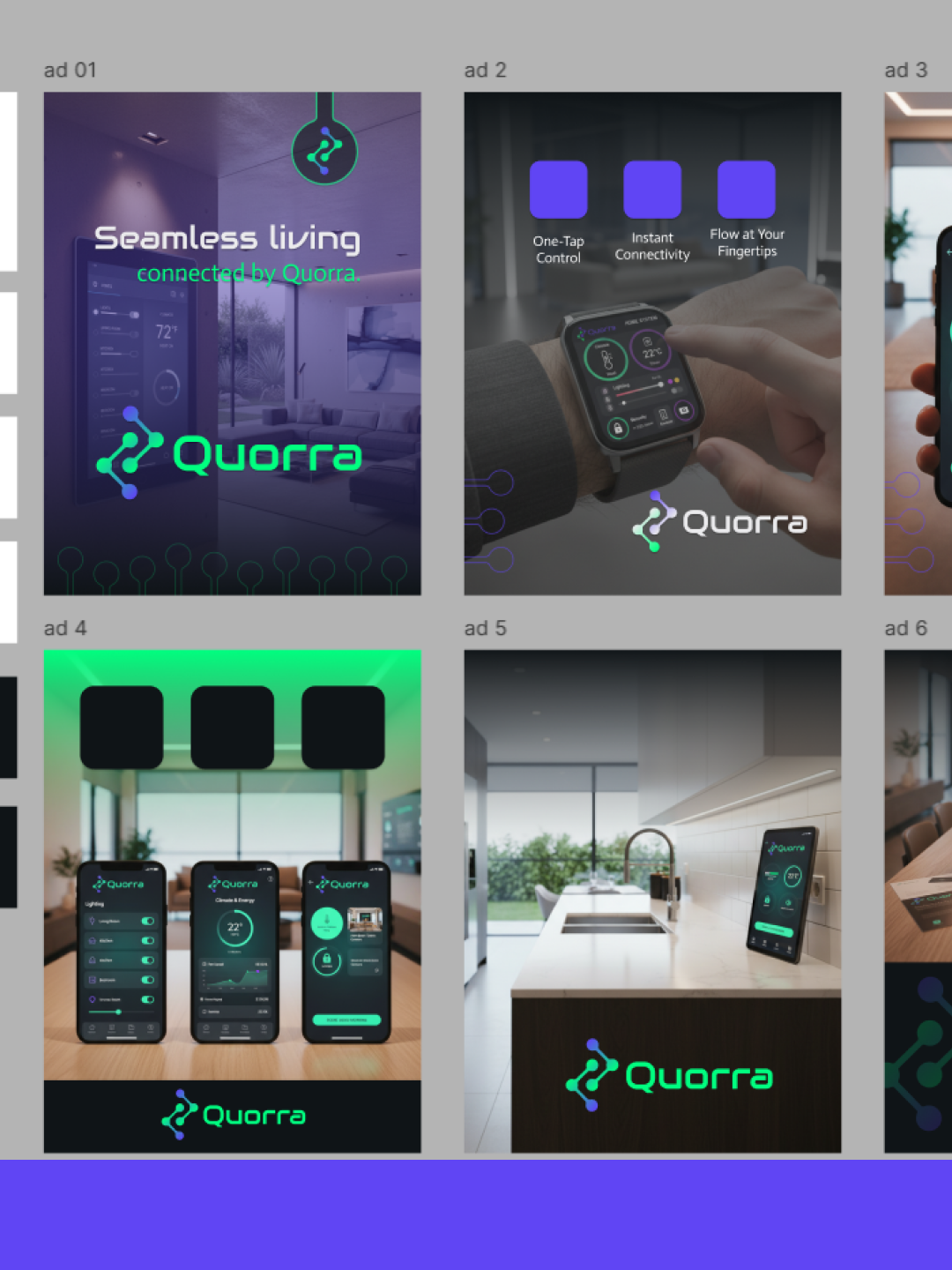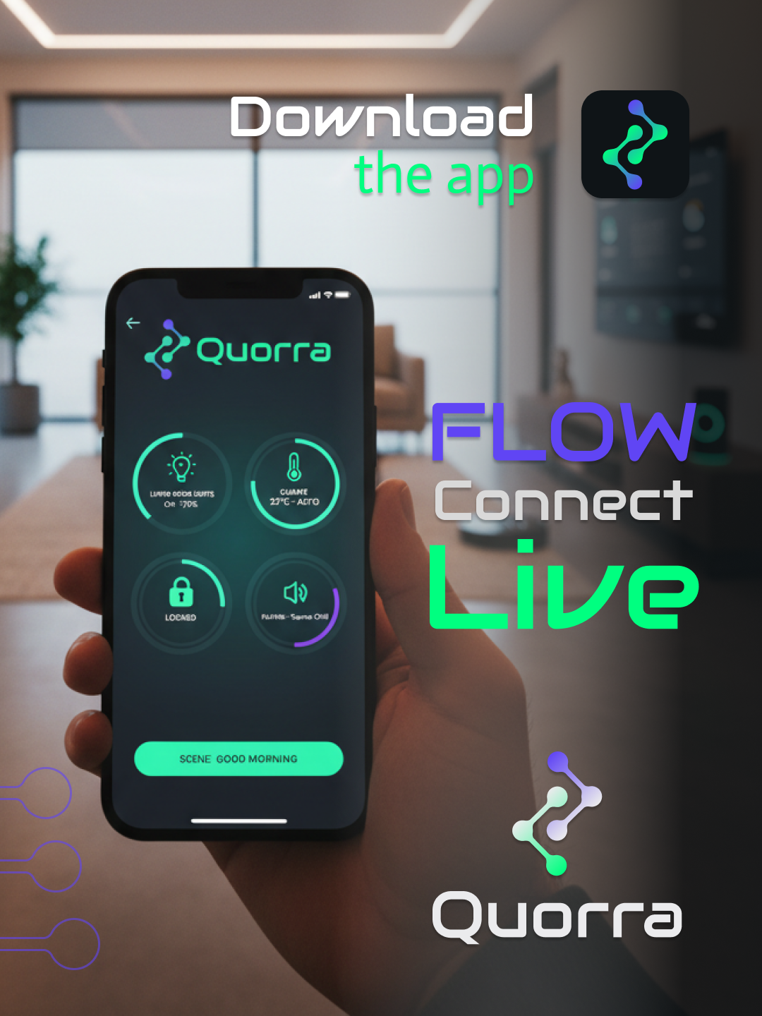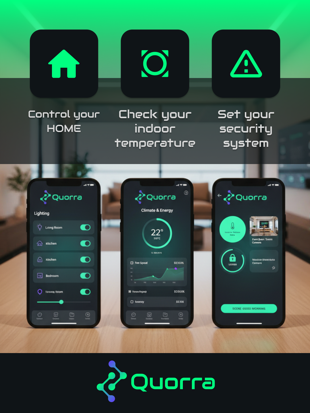 Quorra is a smart home system that seamlessly connects you to every aspect of your home, inside and out. Its design embodies a modern aesthetic, featuring a bold green paired with a subdued blue as the core brand colors. The overall visual identity is crafted to feel simple, intuitive, and effortless.